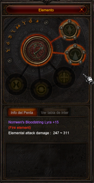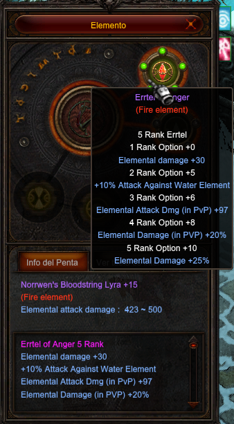 En esta imagen se ve un pentagrama llamado Norrwen's Bloodstring Lyra que esta subido a +15. Este pentagrama tiene sus 2 primeros slot disponibles, para montarle un Errtel of Anger y un Errtel of Blessing.