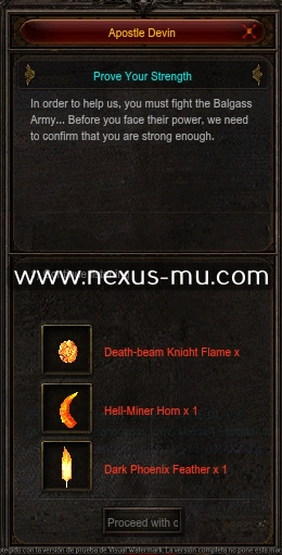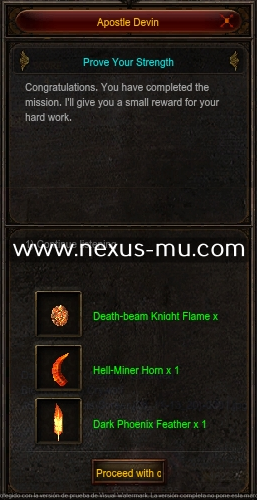 - Condiciones para completarla : Debes de colectar los 3 objetos que se piden: Flame of Death Beam Knight, Horn of Hell Maine, y una Feather of Phoenix of Darkness.